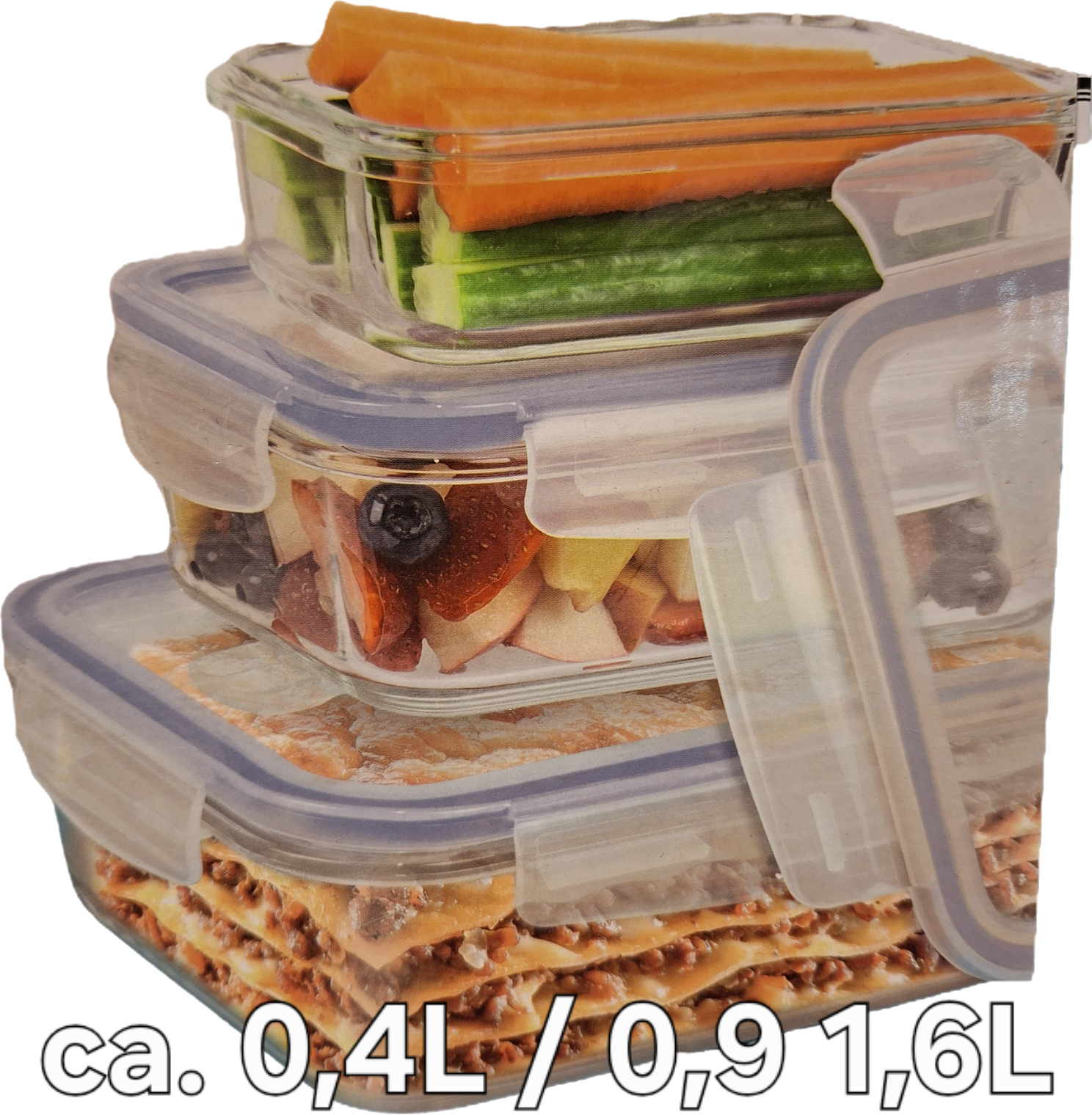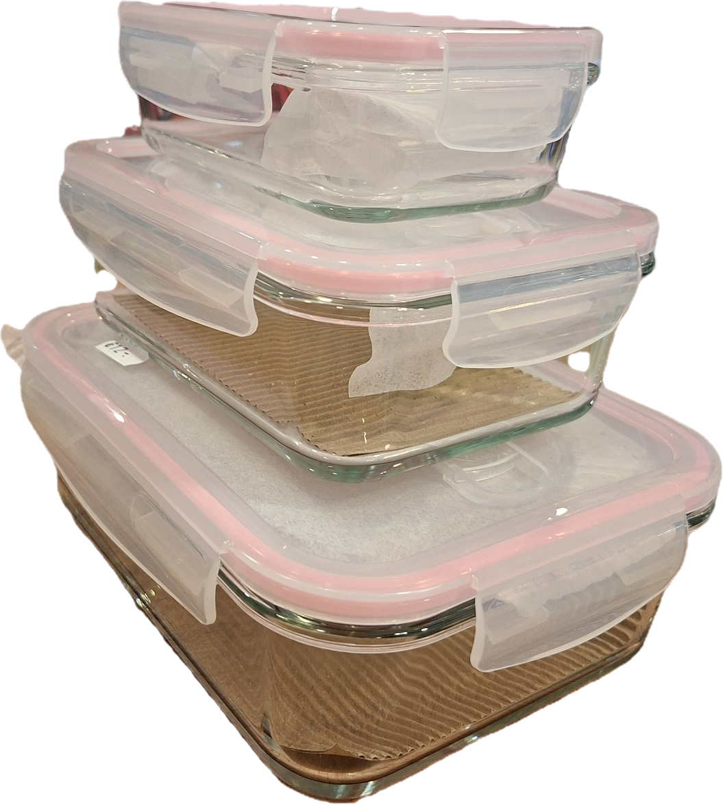 Set of heat-resistant glass containers. Heat resistance: The containers withstand temperatures from -20 °C to 300 °C (body) and from -20 °C to 100 °C (lid). Material: Made of high-quality heat-resistant glass. Usage: Suitable for serving and freezing. Sizes: Available in three sizes: approx. 0.4 L, 0.9 L, and 1.6 L.